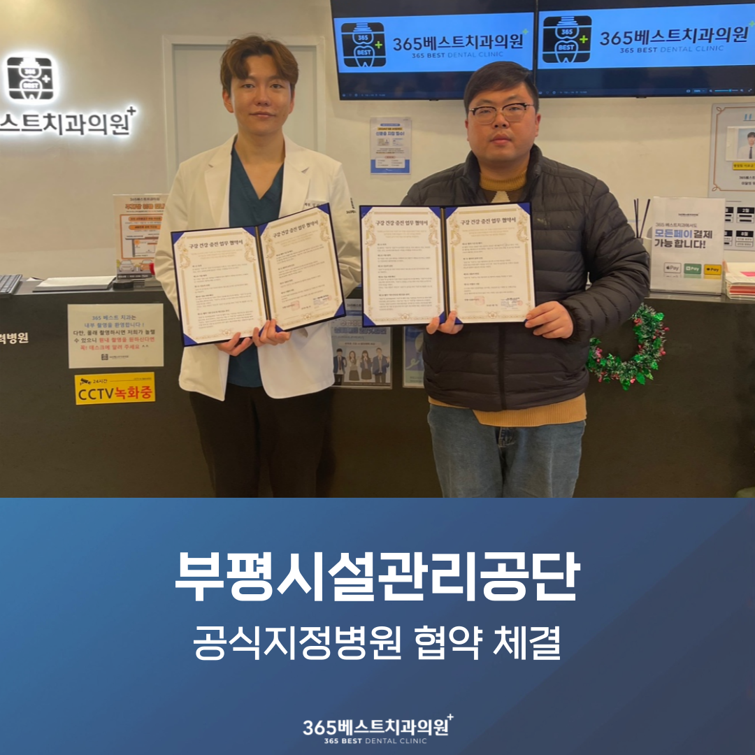 저희 365베스트치과가 부평시설관리공단과 함께 지역사회 구강 건강증진을 위해 협약을 맺게 되었습니다. 앞으로 이 협약을 통해 더 많은 분들에게 양질의 치과 서비스를 제공할 수 있게 되어 정말 기쁩니다 이번 협약을 통해 부평시설관리공단 관계자분들은 저희 치과에서 특별 할인 혜택을 받을 수 있습니다. 치과 방문이 망설여졌던 분들도 이제 부담 없이 방문하셔서 양질의 진료를 경험해보세요. 저희 365베스트치과는 이번 협약을 시작으로 더 나은 지역사회를 만들기 위한 다양한 활동을 계획하고 있습니다. 앞으로 부평시설관리공단 관계자분들뿐만 아니라 지역 주민 모두가 건강한 치아와 자신 있는 미소를 가질 수 있도록 최선을 다하겠습니다. “365일 언제나 당신 곁에 있는 365베스트치과” 단순한 치과가 아닙니다. 지역사회의 동반자로서, 여러분의 구강 건강을 위한 최고의 선택이 될 것을 약속드립니다. |