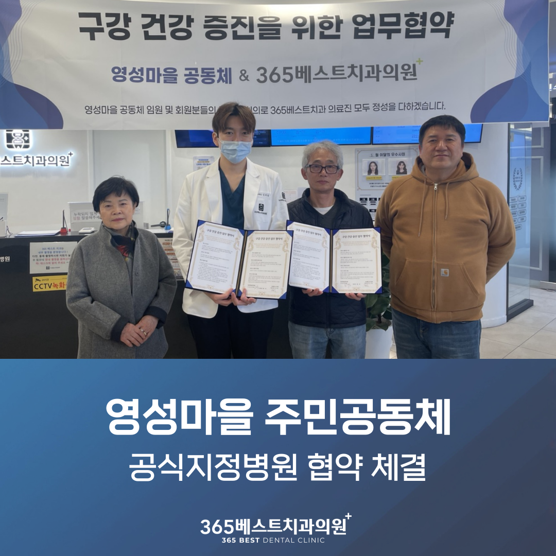 저희 365베스트치과의원이 삼산동에 위치한 영성마을 주민공동체와 업무 협약을 체결하게 되었습니다! 이번 협약을 통해 지역사회에서 복지의 사각지대에 놓인 어르신들에게 보다 나은 의료 서비스를 제공하고, 건강한 삶을 지원할 수 있도록 적극 협력할 예정입니다. 영성마을 주민공동체는 삼산동에 위치한 주민 마을이용 공동시설로, 취약계층 및 차상위계층 어르신들은 물론 복지 사각지대에 계신 분들을 적극적으로 돕고 계시는 뜻깊은 단체입니다. 경제적인 어려움으로 인해 적절한 의료 서비스를 받지 못하는 분들이 많습니다. 특히 치과 치료는 비용 부담이 크기 때문에 정기적인 검진을 받지 못하고 병을 키우는 경우가 많습니다. 이번 협약을 통해 365베스트치과의원은 경제적 여건과 관계없이 어르신들이 치과 치료를 받을 수 있도록 지원을 아끼지 않을 예정입니다. 어르신들에게 구강 건강은 단순한 치과 치료를 넘어, 삶의 질과 직결된 중요한 요소입니다. 치아가 건강해야 음식 섭취가 원활하게 이루어지고, 나아가 전반적인 건강 관리에도 긍정적인 영향을 미치기 때문입니다. 어르신들에게 치아 건강은 단순한 미용적인 요소가 아니라, 건강한 노후 생활을 위한 필수 요소입니다. 구강 건강이 좋지 않으면 음식 섭취가 어려워지고, 영양 불균형으로 인해 전반적인 건강 상태가 악화될 수 있습니다. 또한 치아 상실이 많을 경우 사회적 활동이 위축되고 우울증이 발생할 가능성도 높아집니다. 그러나 많은 어르신들이 치과 치료를 받지 못하는 현실이 있습니다. 비용 부담, 치과 치료에 대한 두려움, 이동의 어려움 등이 주요 원인으로 작용합니다. 이에 365베스트치과의원은 어르신들이 보다 쉽게 치과 치료를 받을 수 있도록 다양한 지원책을 마련하고 있습니다. 365베스트치과의원은 단순히 진료를 제공하는 것을 넘어, 지역사회와 함께 성장하며 더 나은 내일을 만들어가기 위해 노력하고 있습니다. 이번 협약을 시작으로, 영성마을 주민공동체와 긴밀히 협력하여 다양한 의료 복지 프로그램을 운영하고, 어르신들이 건강하고 행복한 삶을 누리실 수 있도록 지원을 아끼지 않겠습니다. 또한, 저희 병원은 10명의 전문의가 협진하는 시스템을 갖추고 있으며, 단순한 충치 치료뿐만 아니라 매복 사랑니 발치, 임플란트 재수술, 당뇨 환자를 위한 맞춤형 임플란트 등 대학병원급의 고난도 시술도 진행하고 있습니다. 이러한 전문성을 바탕으로 어르신들께 보다 안전하고 효과적인 치료를 제공할 예정입니다. 지역사회의 발전과 복지는 우리 모두의 관심과 노력이 함께할 때 더욱 빛을 발할 수 있습니다. 저희 365베스트치과의원은 앞으로도 단순한 의료 기관이 아닌, 지역사회와 함께하는 든든한 동반자로 자리매김하기 위해 노력하겠습니다. |