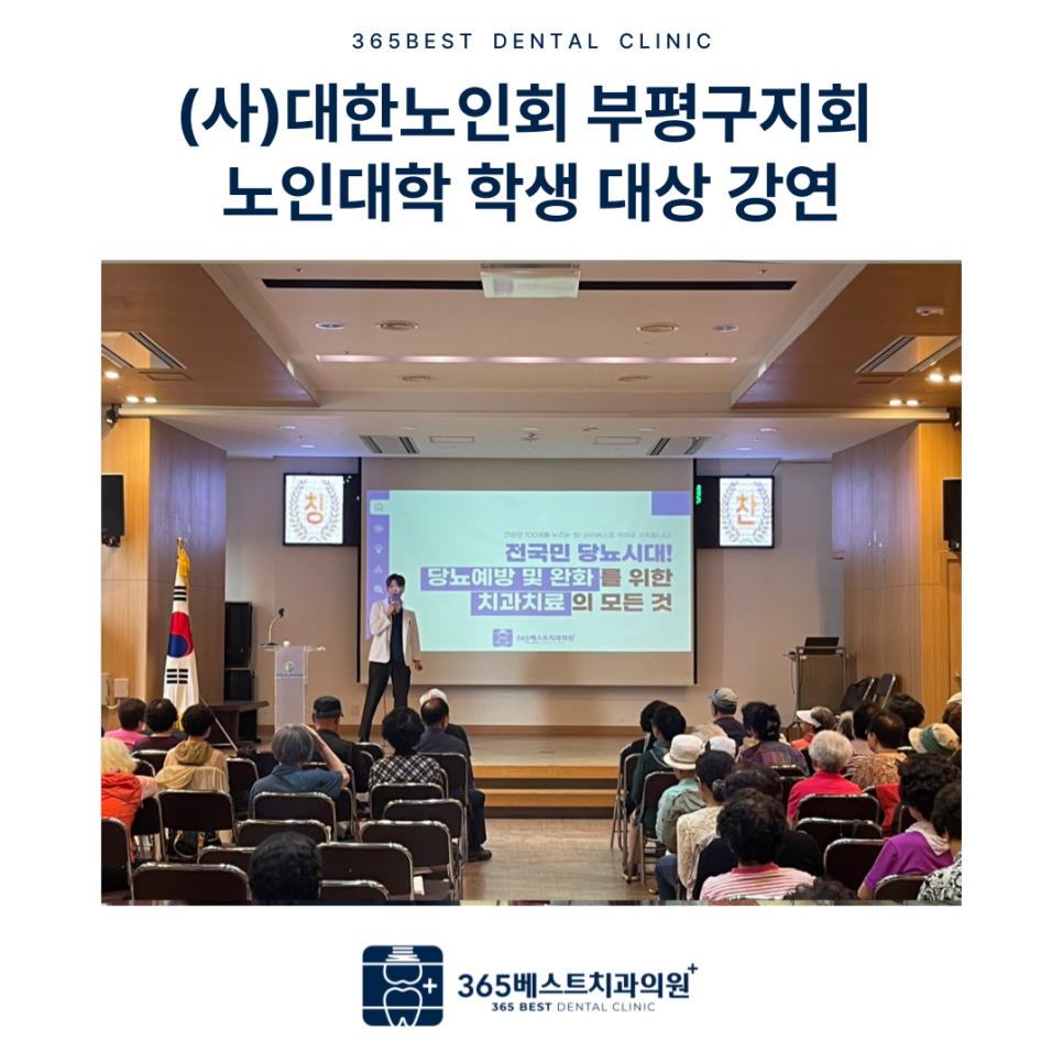 안녕하세요, 365베스트치과입니다. 최근 저희 대표원장 김지웅 원장님께서 대한노인회에서 주관하는 노인대학에 초청받아 어르신들을 대상으로 강연을 진행하고 왔습니다. 이번 강연의 주제는 "당뇨와 치아 건강, 연결고리를 이해하자" 였습니다. 이번 뜻깊은 자리를 마련해주신 대한노인회 관계자 여러분께 진심으로 감사드리며, 어르신 한 분 한 분의 건강한 삶을 위해 앞으로도 365베스트치과는 늘 곁에서 함께하겠습니다. 365일 언제나, 당신의 건강한 미소를 지키는 365베스트치과 드림. |